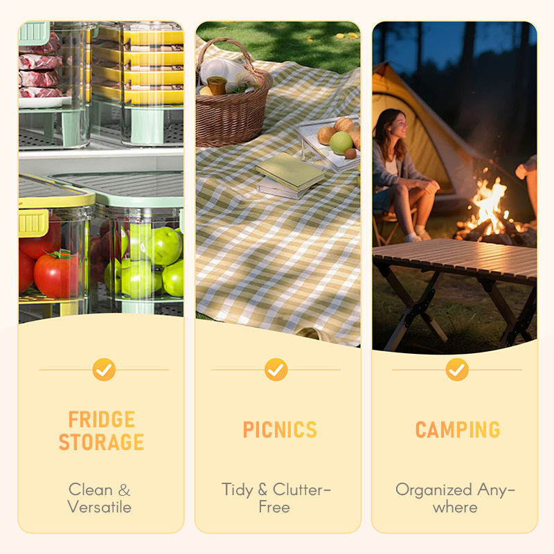 WSZECHSTRONNOŚĆ ZASTOSOWANIA – Idealne do pikników, organizacji lodówki lub przechowywania resztek, pudełko jest łatwe w czyszczeniu i wszechstronne. Jego praktyczna konstrukcja pomaga utrzymać porządek w każdym otoczeniu, zapewniając schludność i uporządkowanie przestrzeni.