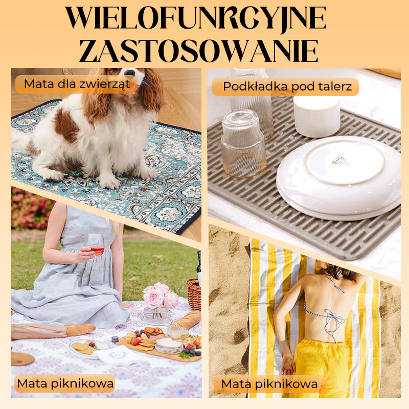WIELOFUNKCYJNE ZASTOSOWANIE: Poza potrzebami zwierząt, mata może służyć jako podkładka pod miski, kompaktowy dywanik podróżny lub lekka poduszka do użytku wewnątrz i na zewnątrz, oferując wszechstronne rozwiązania w domu.