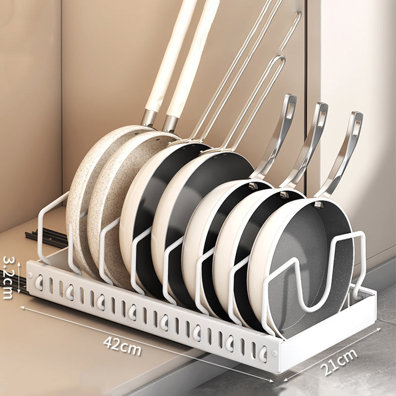 WIELOFUNKCYJNOŚĆ – Oprócz garnków i patelni, organizer ten doskonale nadaje się do tac, desek do krojenia i innych płaskich niezbędnych elementów wyposażenia kuchni. Jego wszechstronna konstrukcja maksymalizuje przestrzeń w szafce, zapewniając porządek i łatwość znalezienia wszystkich przedmiotów.