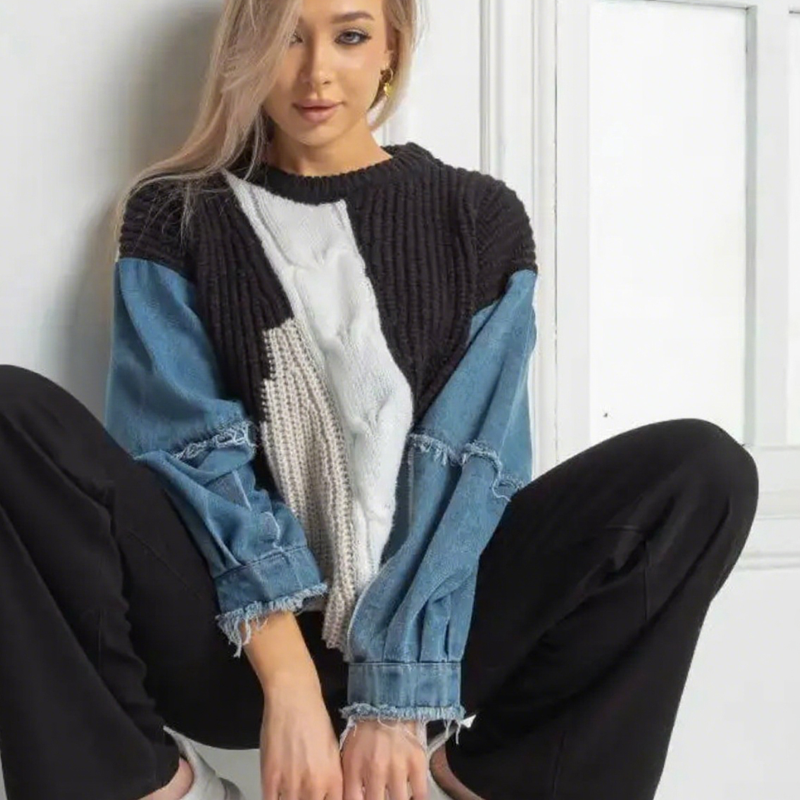 WYJĄTKOWY STYL PATCHWORK: Ten damski sweter charakteryzuje się kreatywnym wzorem patchworkowym z dżinsu i dzianiny, który łączy w sobie swobodny urok z nowoczesną modą. Kontrastujące faktury nadają mu interesujący wygląd, dzięki czemu jest to element garderoby, który z łatwością podnosi rangę codziennych stylizacji.