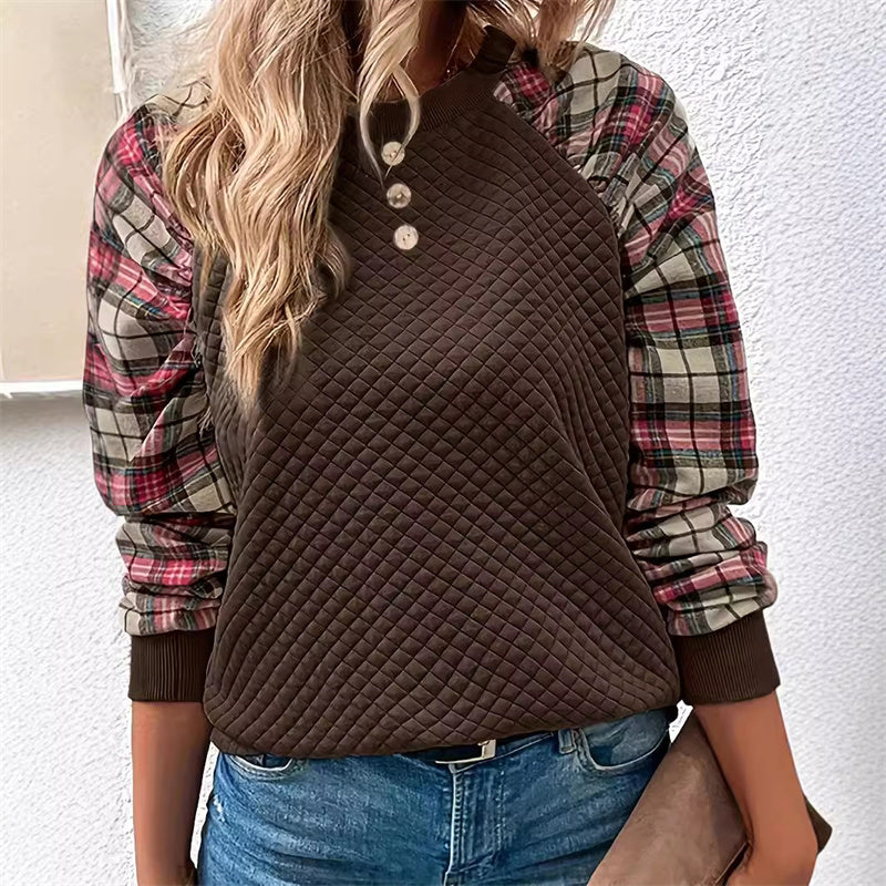 👚Damska bluza z rękawami w kratę i okrągłym dekoltem